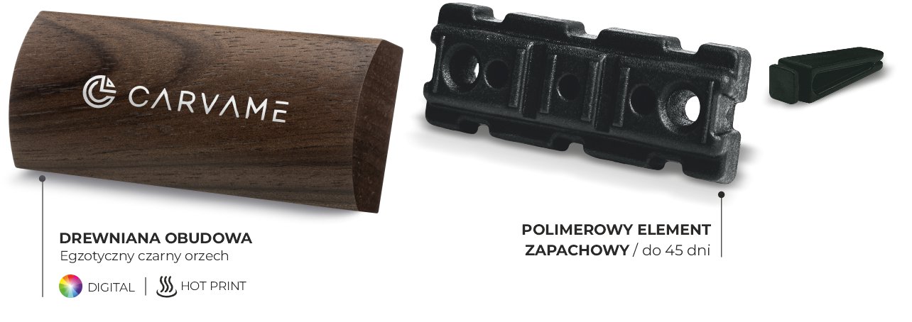 Zapachy Premium Wood Oval dostępne są w 4 specjalnie zaprojektowanych opakowaniach. Pierwszy to blister klejony który zawiera plastikową obudowę z polimerowym frontem wraz z wkładem, drugi zawiera plastikową obudowę z polimerowym frontem i 2 wkłady zapachowe, trzeci to blister zgrzewany. Czwarte opakowanie to pudełko papierowe premium, które jeszcze bardziej podkreśli jakość zapachów CARVAME. Pudełko papierowe czarne lub białe mogą być obrendowane dowolnym logo w kolorze srebrnym lub złotym od ilości 100szt. Od 2000szt. całe pudełko może zostać wydrukowane z indywidualną grafiką.