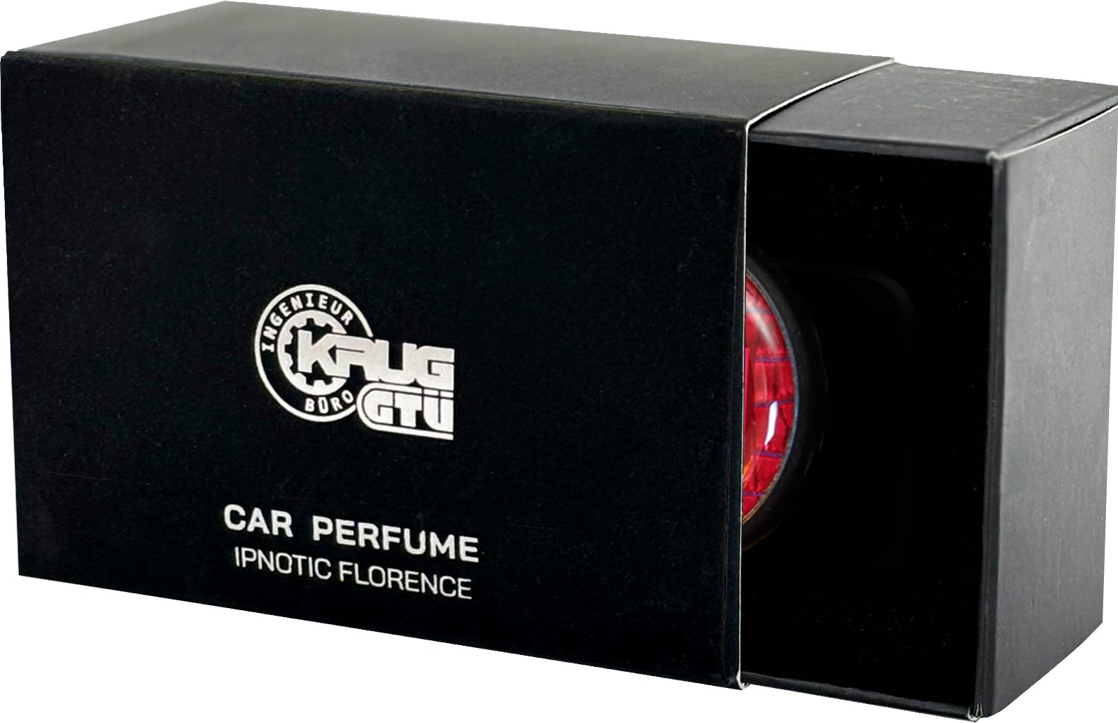Each of our fragrances is made of three elements. Aluminum casing with a print or engraving, a polymer fragrance element which lasts for 45 days and a universal mount for mounting in the ventilation grille of your car.